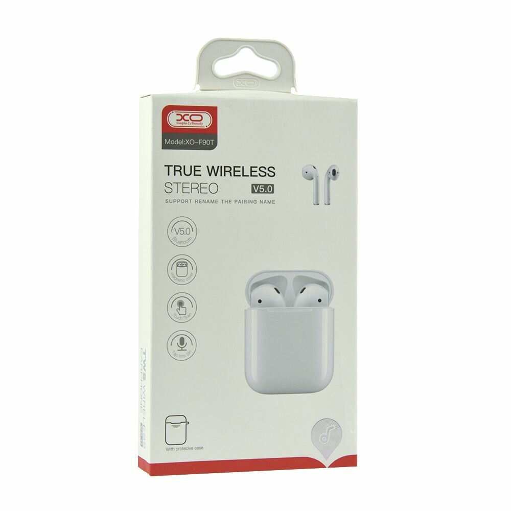 Bluetooth стерео гарнітура XO F90T TWS - класичні повністю бездротові навушники-вкладиші, що виділяються чистим, деталізованим звучанням з ідеальним балансом частот. Невелика вага даних навушників, їхня ергономічна, ретельно продумана форма забезпечують максимально комфортну посадку у вушні канали, дозволяють із зручністю прослуховувати музику та приймати дзвінки протягом усього дня. Корпусні деталі вушних елементів виготовлені з приємного на дотик, міцного пластику з глянсовою поверхнею. Стабільний зв'язок гарнітури з джерелом звуку, відсутність сторонніх шумів та обривів гарантує Bluetooth V5.0, а її тривалу безперервну роботу протягом 3 годин – акумулятори ємністю 30mAh. Аксесуар підтримує функцію спливаючого вікна та перемикання між провідним і веденим навушником, оснащений сенсорним керуванням та чутливим мікрофоном, який реалістично передає мову. Легкий компактний зарядний кейс має вбудовану батарею ємністю 300mAh, LED індикатор і роз'єм для зарядки. Bluetooth стерео гарнітура XO F90T TWS - зразок поєднання ціни та якості серед товарів даного класу.