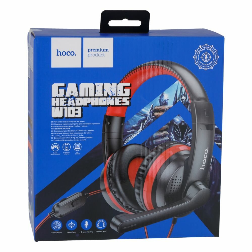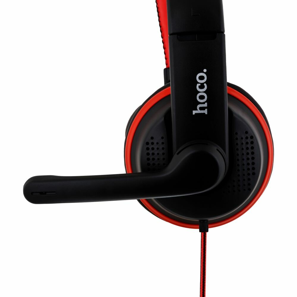 Повнорозмірні навушники Hoco W103 PC Magic - відмінний вибір для тих, хто цінує високу якість звуку. Аксесуар поставляється в брендовий упаковці, представлений в двох стильних кольорах: класичному чорному і чорному з червоними елементами. Завдяки потужним динамікам діаметром 40 мм гарнітура здатна відтворювати звук з чіткими високими частотами і глибокими басами. Шумоподавляючий всенаправленний мікрофон з подовженою ніжкою і можливістю повороту на 120 ° забезпечить комфорт і безпроблемне спілкування з партнерами по грі. Корпус пристрою надійно зібраний, виготовлений з міцного пластику, обід і м'які подушки амбушур обшиті приємною на дотик шкірою. Оголів'я зі слайдером дозволяє пристосувати навушники до анатомічних параметрів будь-якої людини. Кабель з однією точкою кріплення має довжину 1,2 м, оснащений штекером mini-jack 3,5 мм, пультом з регулятором гучності і перемикачем мікрофона. Гарнітура комплектується перехідником AUX - 2x3.5 мм.