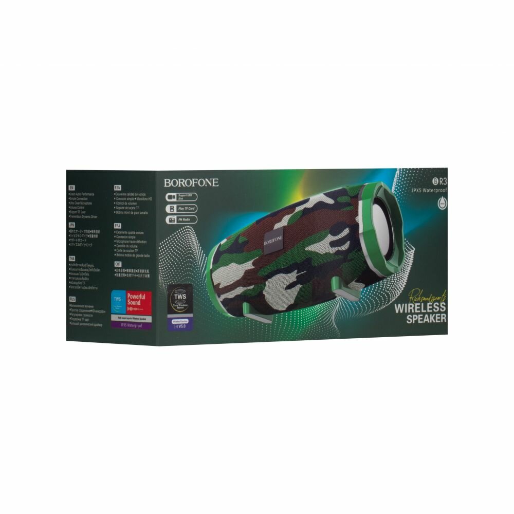 Портативна bluetooth колонка Borofone BR3 - ідеальне поєднання звуку, ергономічності і вишуканого дизайну, представленого декількома кольорами. Насичене звучання без спотворень і сторонніх шумів гарантують якісні електронні компоненти з двома динаміками потужністю по 5 Вт і пасивними випромінювачами. Корпус аксесуара захищений від води, виготовлений з міцного пластику, виконаний в приємній на дотик текстильній обшивці. Колонка оснащена FM-приймачем і мікрофоном, здатна програвати музику з карт пам'яті і USB флешок. Вбудований модуль Bluetooth V5.0 і роз'єм AUX допоможуть підключити колонку до джерела звуку за допомогою дротового і бездротового підключення. Батарея класу А 18650 ємністю 1200 mAh забезпечить безперервну роботу аксесуара в режимі програвання музики або розмови протягом 3 годин при 80% гучності. Роз'єм Micro-USB допоможе зарядити пристрій, відповідний йому кабель входить в комплект разом з кабелем AUX.