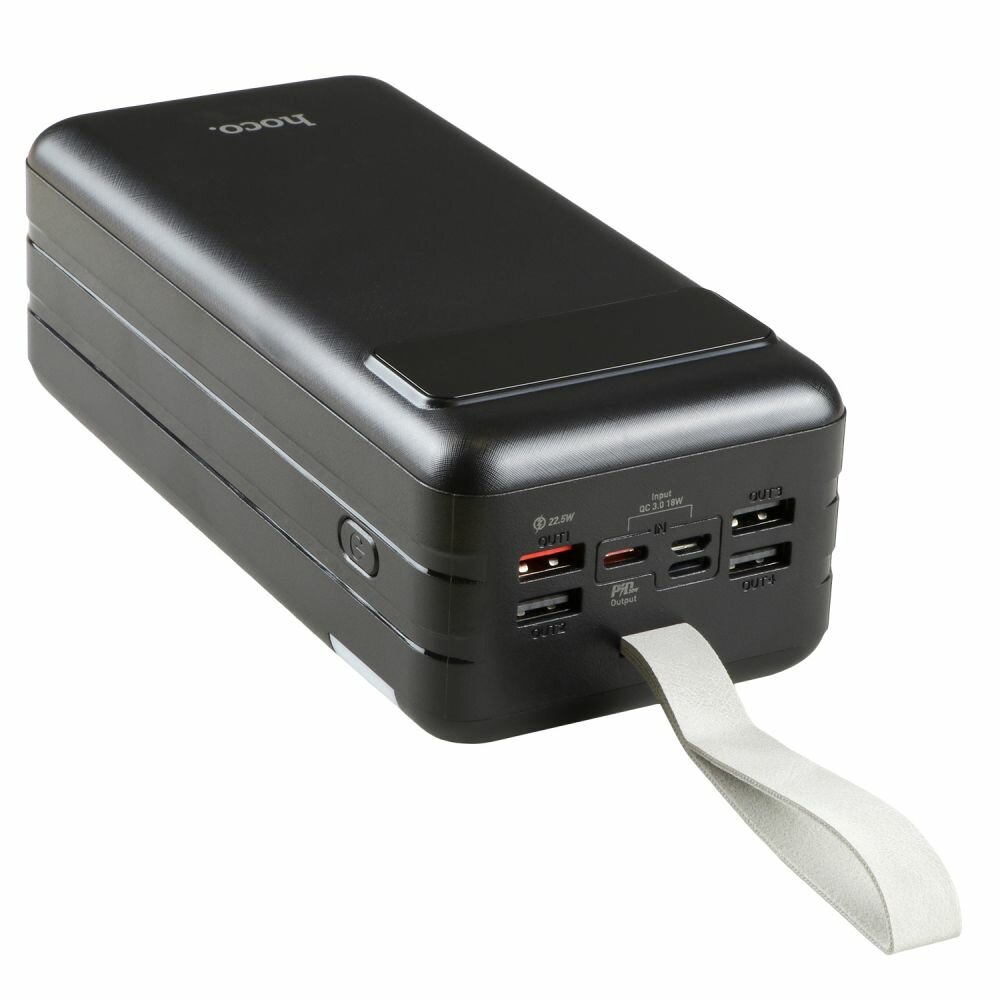 Power Bank Hoco J86B Electric виділяється підвищеною ємністю, що дорівнює цілих 60000mAh, підтримкою найбільш поширених протоколів швидкої зарядки та наявністю відразу 7 роз'ємів. Модель виконана в стильному, практичному дизайні, доповненому зручним ремінцем та відмінним ліхтарем. Надійно зібраний корпус аксесуара виготовлений із міцної ABS пластику та полікарбонату. На його лицьовій текстурованій панелі знаходиться LED дисплей, який відображає рівень заряду вбудованої батареї у відсотках та активується за допомогою механічної кнопки. Для її швидкої зарядки за протоколами QC, FCP та AFC є роз'єми Lightning та Micro-USB, максимальна потужність на виході яких може досягати 18Вт. Зарядити сторонні гаджети допоможуть 3 роз'єми USB з силою струму на виході 2.1А і порт USB, який підтримує технології QC, SCP, FCP і AFC з вихідною потужністю 22.5Вт. Також повербанк оснащений роз'ємом Type-C, який може постачати живлення в обидві сторони за протоколами PD, QC, FCP і AFC з вхідною потужністю 18Вт і вихідною 20Вт.