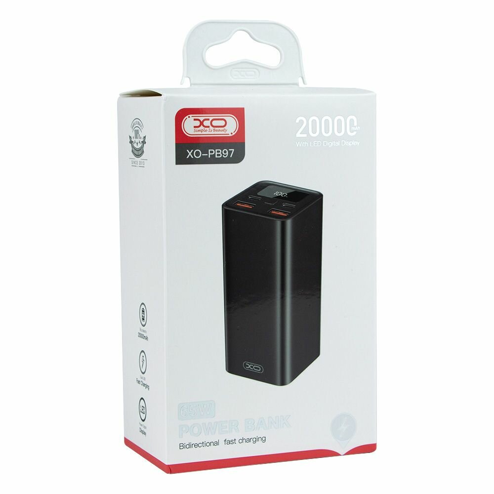 Power Bank XO PB97 – це функціональний аксесуар, який допоможе з повним комфортом та за мінімальний час зарядити більшість сучасних смартфонів, планшетів та деякі моделі ноутбуків. Пристрій виділяється невеликими розмірами та вагою, має заокруглені бічні ребра та приємну на дотик поверхню. Його надійно зібраний корпус виготовлений із міцної комбінації ABS пластику, полікарбонату та алюмінієвого сплаву. У торці аксесуара знаходяться 2 USB порти та 2 роз'єми Type-C, а також LED дисплей та механічна кнопка, які допоможуть визначити рівень заряду вбудованої батареї ємністю 20000mAh. Роз'єми Type-C можуть використовуватися для швидкого заряджання сторонніх гаджетів за протоколами PD2.0/3.0 та BC1.2, а USB порти - QC2.0/3.0, AFC, FCP, SCP, VOOC з максимальною вихідною потужністю 22.5Вт. Потужність на виході першого роз'єму Type-C може досягати 60Вт, другого - 65Вт, максимальна потужність на вході складає 55Вт і забезпечується технологіями PD2.0/3.0 і PPS. Загальна сила струму на виході роз'ємів – 3А.