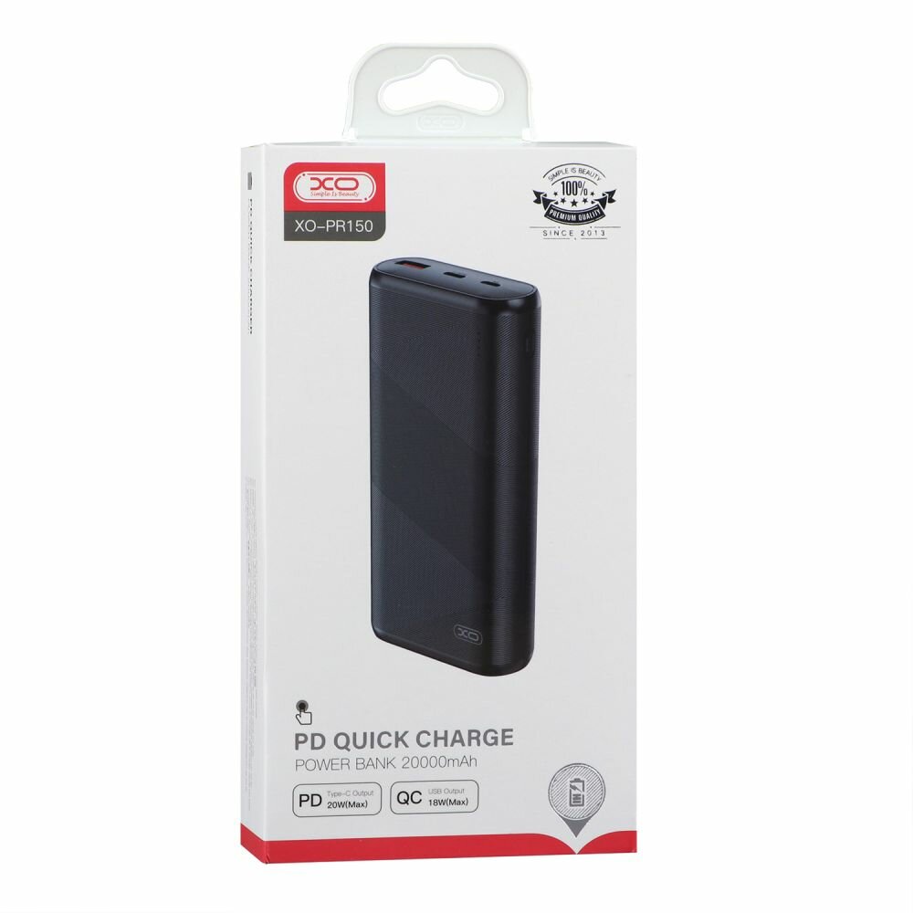 Power Bank XO PR150 - це оригінальне поєднання сучасних технологій та стильного, практичного дизайну. Модель виділяється привабливим зовнішнім виглядом, простотою у використанні та підтримкою швидкої зарядки, що значно прискорить час зарядки її вбудованої батареї ємністю 20000mAh та смартфонів або планшетів, що підтримують протоколи QC та PD. Надійно зібраний корпус аксесуара виготовлений із міцного пластику, виконаний у зручній формі із заокругленими бічними гранями, скошеними ребрами торців та приємною на дотик поверхнею, яка декорована геометричним візерунком, утвореним тисненими лініями. Легко визначити рівень заряду повербанка допоможуть LED індикатори та механічна кнопка для їх активації, а зарядити її з максимальною вхідною потужністю 18Вт – роз'єми Type-C та Micro-USB. Для зарядки планшетів, смартфонів та інших пристроїв з потужністю до 18Вт є той самий роз'єм Type-C, здатний подавати живлення в обидві сторони, і USB порт, потужність на виході якого може досягати 18Вт.